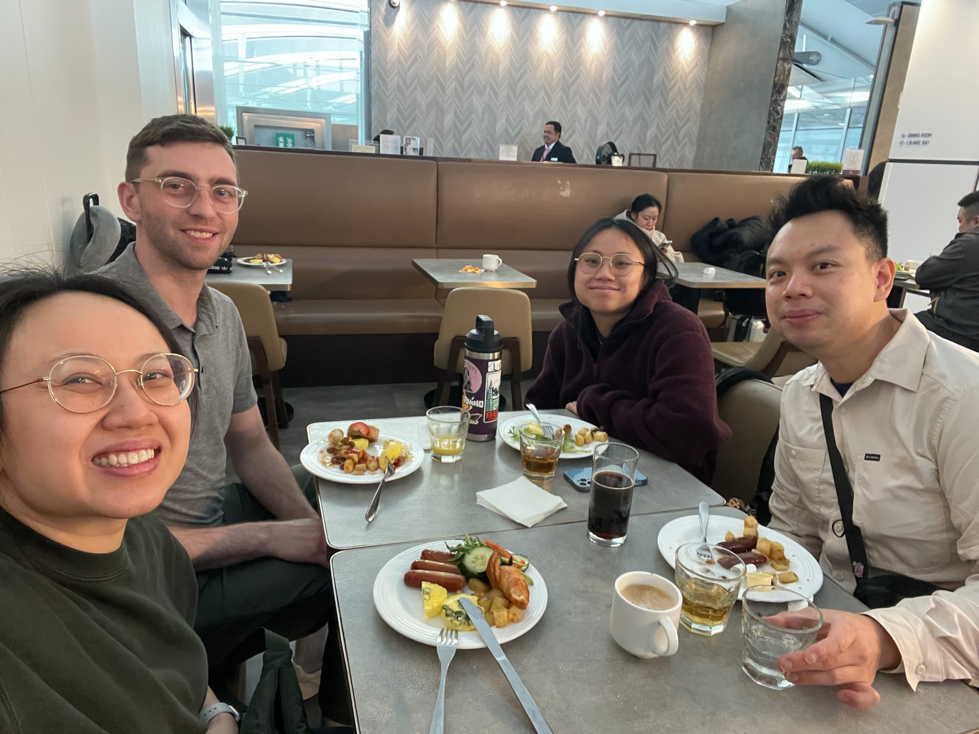 Kelvin had some Dragon Passes that got us into one of the lounges at Pearson. It was definitely a nice start to the trip, especially since Christine and Jeff left Halifax at 7 am. Also, my sister and Jeff have never tried airport lounges before, so it was a new experience. I wish we could have gotten into the Maple Leaf lounge, but it wasn’t an option. Also, Jeff was recovering from a recent illness, fever and all, so we needed to take it easy.